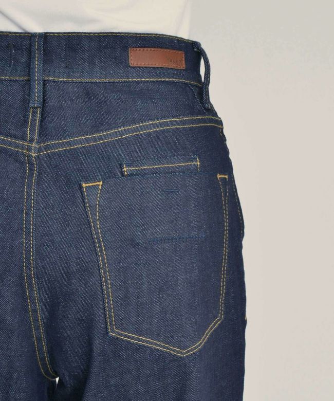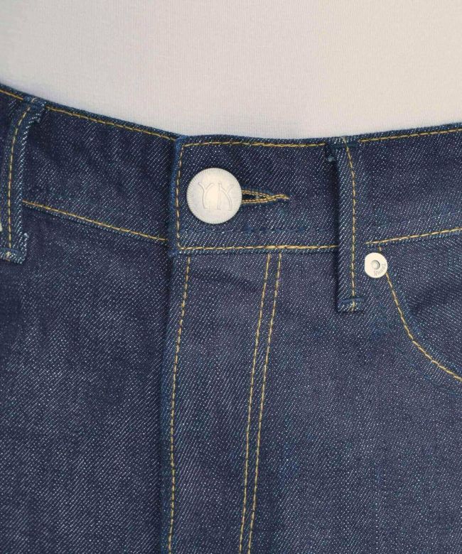 【素材】 定番のストレッチデニムでほど良いハリ感とリラックス感のある履き心地で、硬いイメージがあるワンウォッシュカラーでも快適に穿いていただけます。きれいにまとまるワンウォッシュの色味としっかりと深さのある股上で、カジュアルなトップスはもちろんテーラードジャケットなどのキレイめアイテムとも相性がよく、季節や気分によって合わせるアイテムを変えられる着回し力抜群な1枚です。ウエストベルトの裏地を色移りしにくいデニム生地を使用しているので、トップスインでも穿いていただけます。