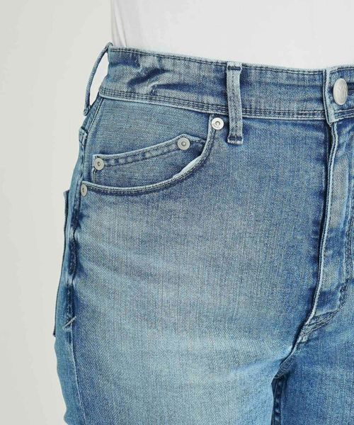 濃過ぎず薄過ぎず、通年使える万能カラーです。おなか周りに霧のようなグラデーションを繊細につけてヒゲやスリを表現。YANUKならではの加工で、ぼんやりしている中にもメリハリがあり、間延びしがちなハイウエストのおなか周りも自然にカモフラージュしてくれます。前モモのスリが内側よりの上の方に入っていることで目線が上がり、脚を細く長く見せてくれます。