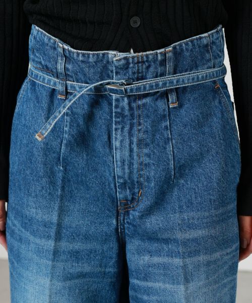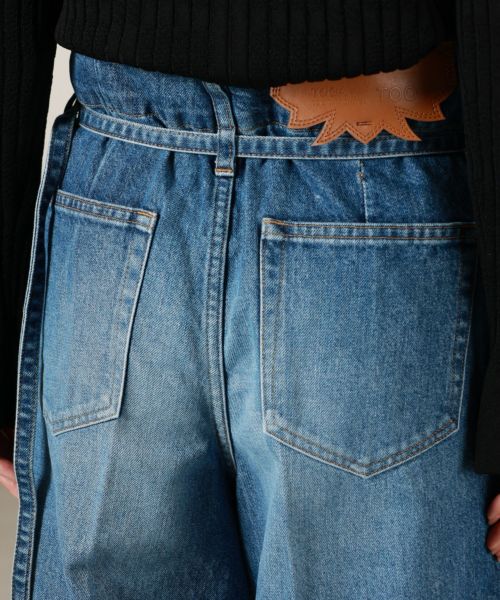 【デザイン】 TOGA PULLA(トーガプルラ)のワイドデニムパンツ。ウエストの共布のベルトと切りっぱなしの裾とがスタイルのポイントに。ウエストインした時のバックのレザーパッチのデザインもTOGAらしく、おしゃれ心をくすぐります。