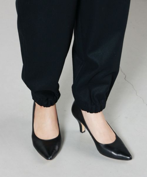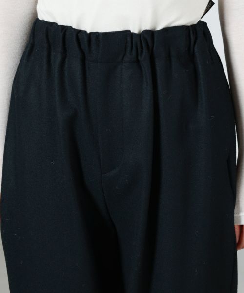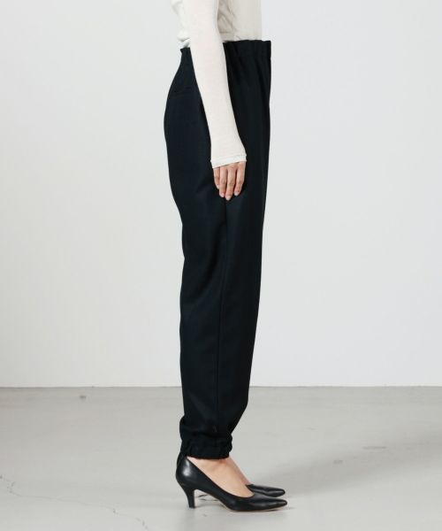【デザイン】SACRA(サクラ)のパンツ。裾が絞られたテーパードシルエットで、すっきりとしたラインを描きながらもスポーティなニュアンスを漂わせる一本です。裾にはゴムを配し、軽快でアクティブな印象をプラス。ベルトループを省いたデザインにより、ウエストまわりはフラットで洗練された見た目に仕上がっています。シンプルなトップスと合わせても様になり、シャツやジャケットと合わせればモードな大人カジュアルスタイルが完成します。