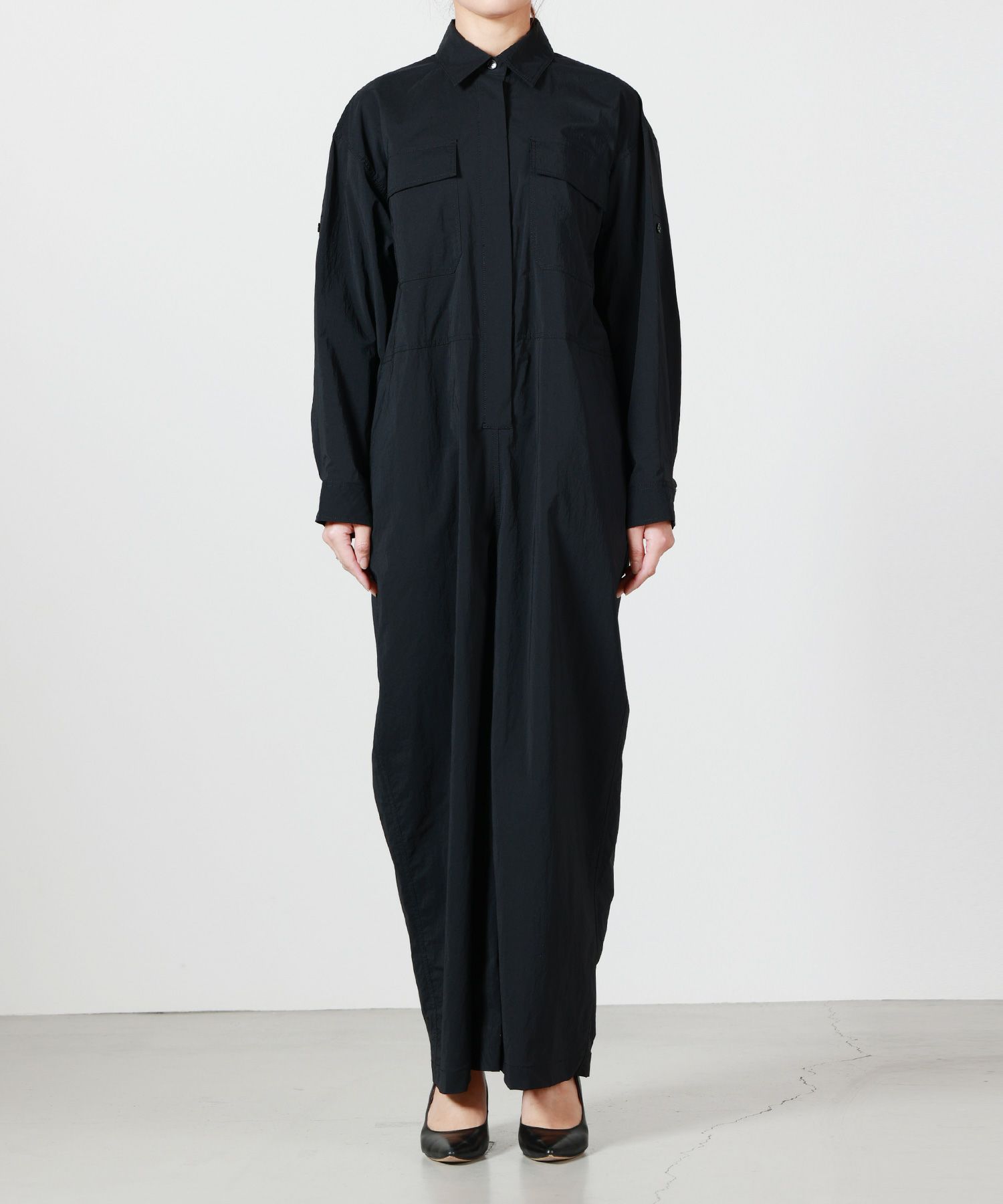 【デザイン】 SACRA(サクラ)のジャンプスーツ。カジュアルなジャンプスーツを、SACRAらしい洗練されたバランスで仕上げた一着です。程よくゆとりのあるシルエットが身体のラインを拾いすぎず、リラックス感がありながらもだらしなく見えない設計。特殊加工による素材の表情が、シンプルなデザインに奥行きを与えています。スリーブはロールアップ可能な仕様で、着こなしに軽やかな変化をプラス。手元をすっきり見せることで、女性らしい抜け感をさりげなく演出します。一枚でスタイリングが完成する主役アイテムながら、足元や小物次第でカジュアルからきれいめまで幅広く対応します。