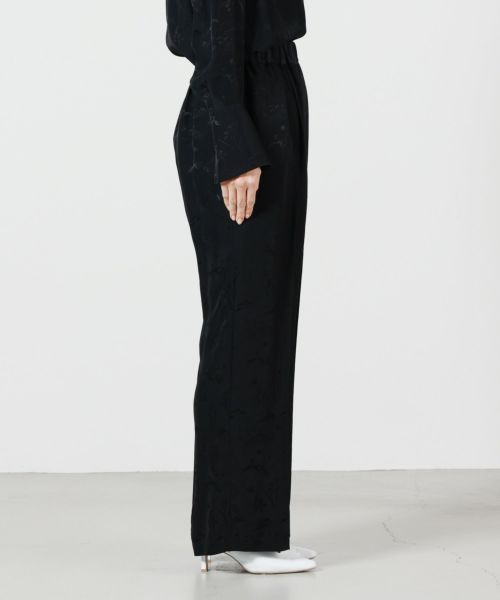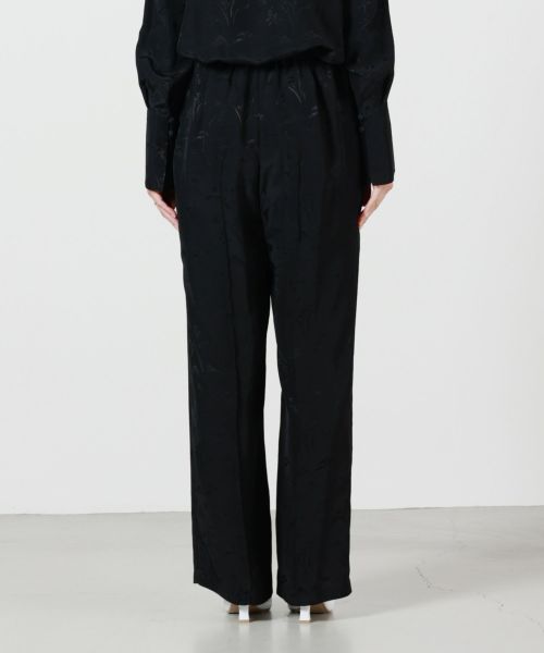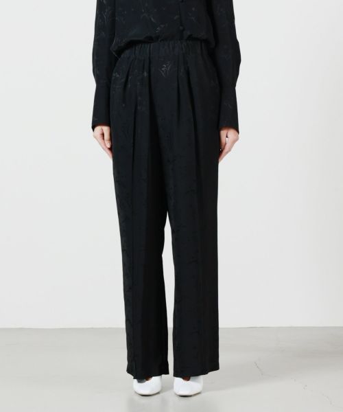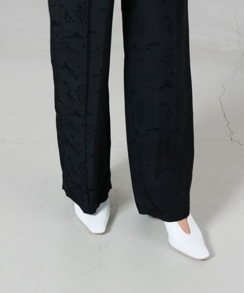 【デザイン】Mame Kurogouchi(マメクロゴウチ)のパンツ。 琉球漆器の螺鈿紋様や沖縄の伝統染め「紅型(びんがた)」にインスパイアされた花鳥柄が特徴的なジャカードパンツです。繊細な柄の陰影を際立たせるために、織りの組織まで細かく調整され、立体感のあるデザインに仕上げられています。ウエストはゴム仕様でリラクシングな履き心地ながら、ストンと落ちるシルエットとセンタープリーツが品のある表情を演出。リラックス感とエレガンスが両立した、唯一無二の一着です。