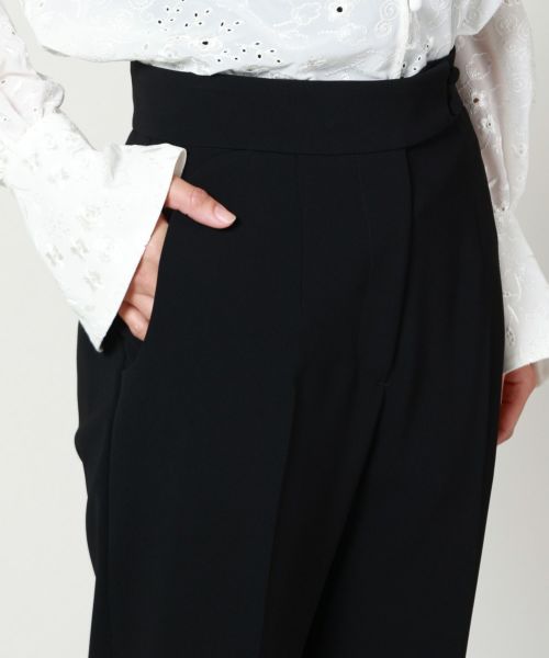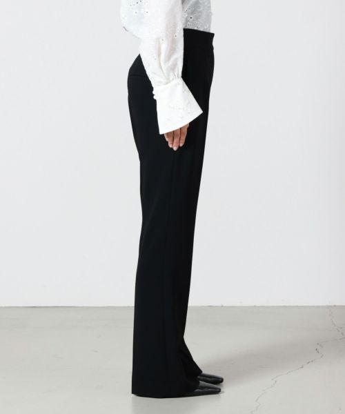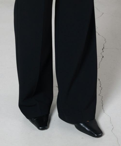 【素材】トリアセテートとポリエステルの特殊仮撚加工糸を使用した、なめらかで上品な艶をもつ生地を採用。手に取るとしっとりとした柔らかさと適度なハリがあり、着用時にはシルクのような落ち感を感じられます。 ストレッチ性があり動きやすく、長時間の着用でもシワになりにくい機能素材。忙しい日々の中でも美しいラインを保ち、イージーケアで扱いやすいのも魅力です。見た目はエフォートレスながらも、細部にまで上質さが宿る一本です。