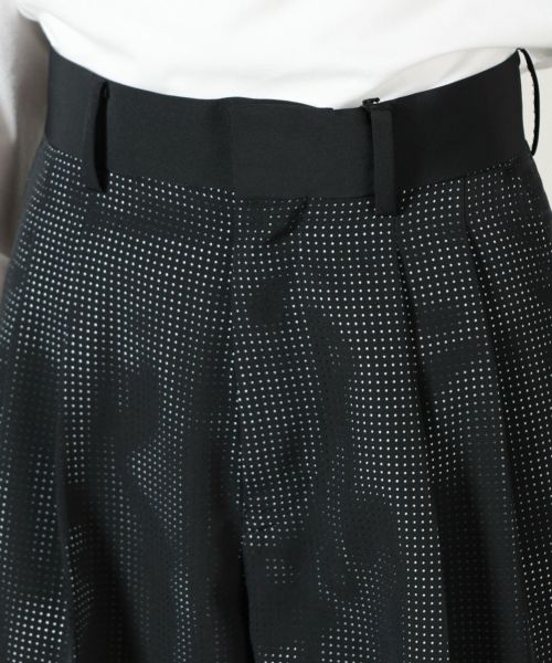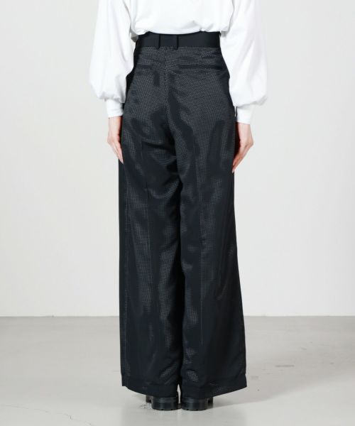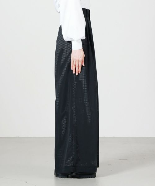 【デザイン】HYKE(ハイク)のパンツ。ポリエステルタフタにドットのパンチング加工を施し、軽やかで遊び心のあるデザインに仕上げています。裏地をあえて白にすることで、ドットの透け感がより際立ち、スタイリングに抜け感をプラス。シンプルなトップスと合わせても華やかさを添えてくれる一枚です。