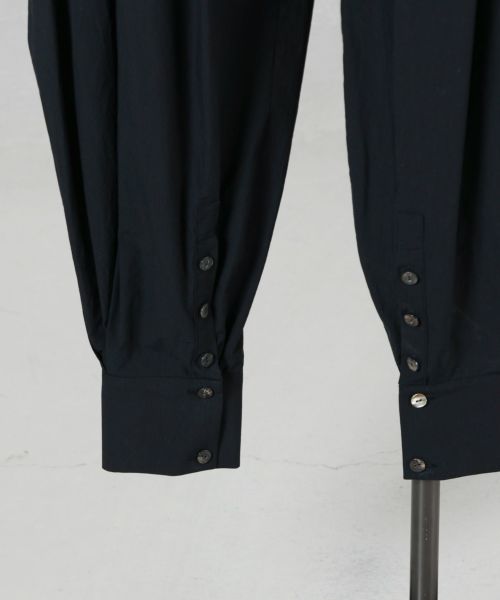 【デザイン】ENFOLD(エンフォルド)のパンツ。裾にシャツのカフスとケンボロがついているようなデザインがポイントのジョガーパンツ。裾でタックを取りボリュームを出して脚のラインを隠してくれます。裾のカフスのボタンを止めて履くのもいいですが、外してスリットありのパンツとして履くのもオススメです。