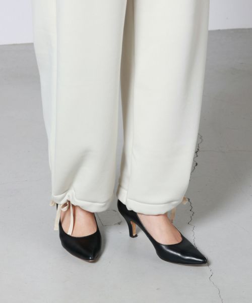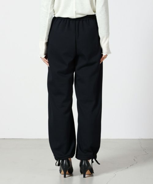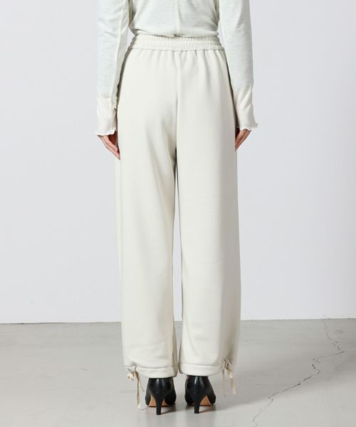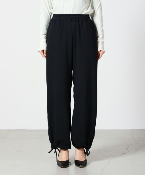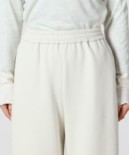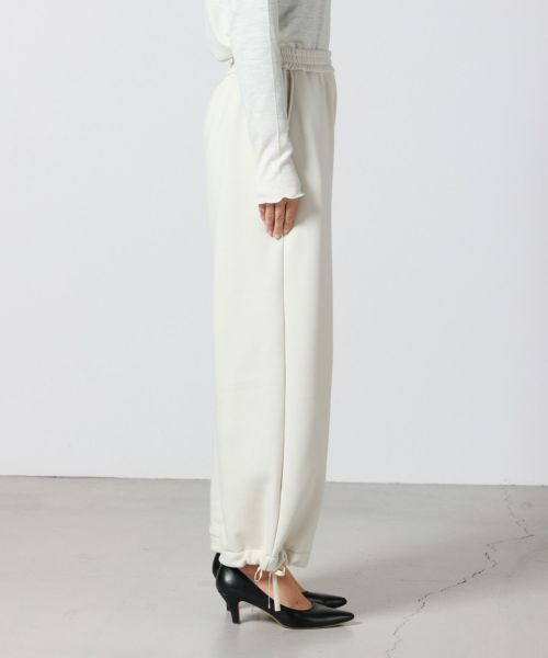 【デザイン】 MICA&DEAL(マイカアンドディール)のワイドパンツ。リラックス感あるウエストゴムで着心地も抜群。部屋着やスゥエットに見えないように、シルエットはややコクーンにしており、タウンユースにも活躍する1着。裾は紐が付いており、形を変えていただくことが可能です。