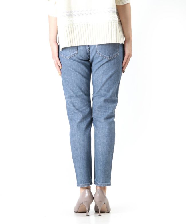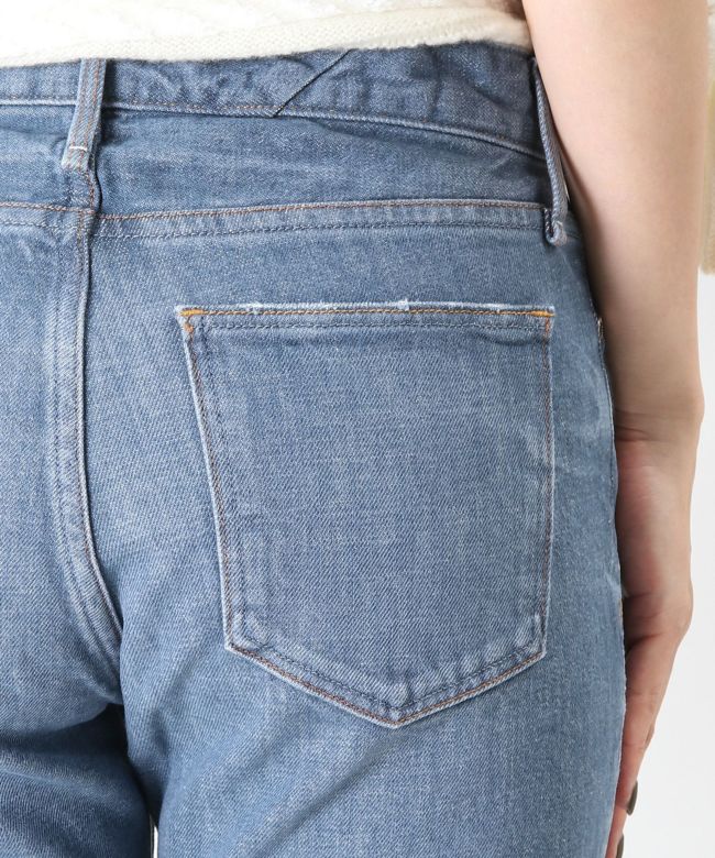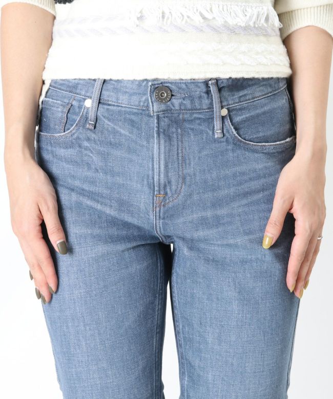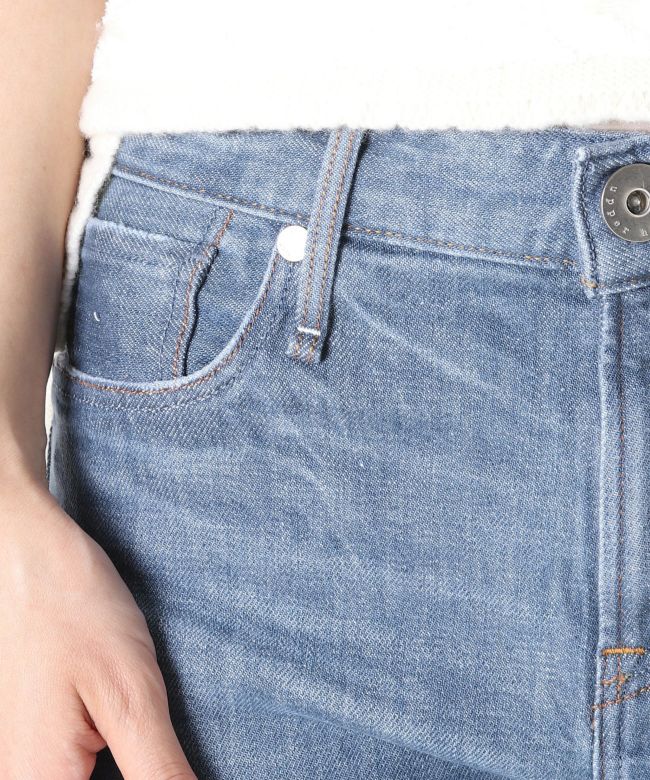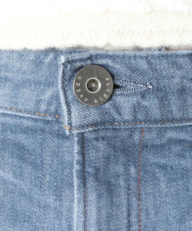 【デザイン】 upper hightsの定番のGIRLFRIEND(SKINNY BOYFRIEND )ストレッチデニム「THE STELLA」 太すぎないスッキリとしたスタイリッシュなボーイズシルエットが最大の特徴。9分丈設定にしているため、お直しいらずでジャストレングスで裾の加工感も楽しめます。タテ糸にショートスラブのムラ糸を使用し、程よくアクセントのあるプレーンな表情のテキスタイルを採用。通常とは異なる染色方法で染めているので、インディゴとは異なるマットなカラーが特徴のNew Blue Denim。21FW一押しのカラーです。