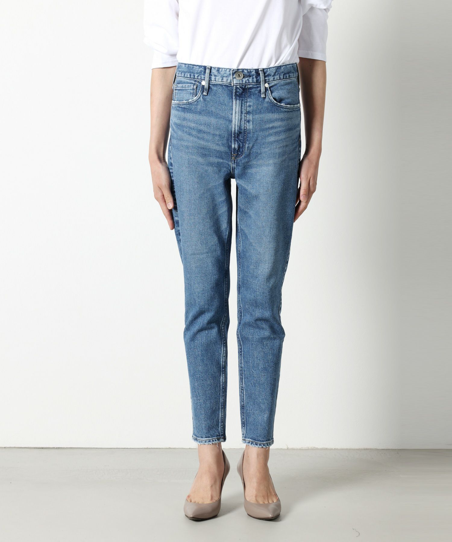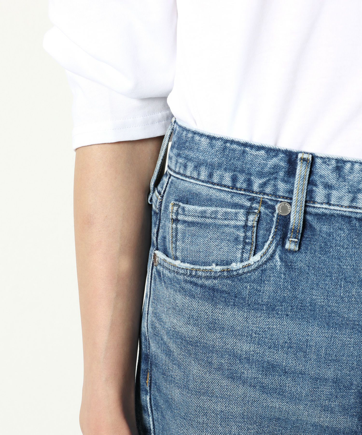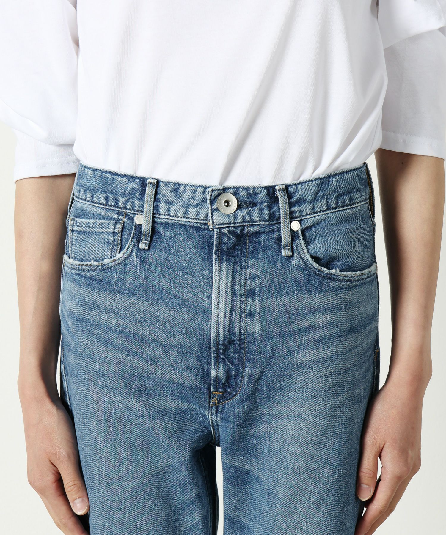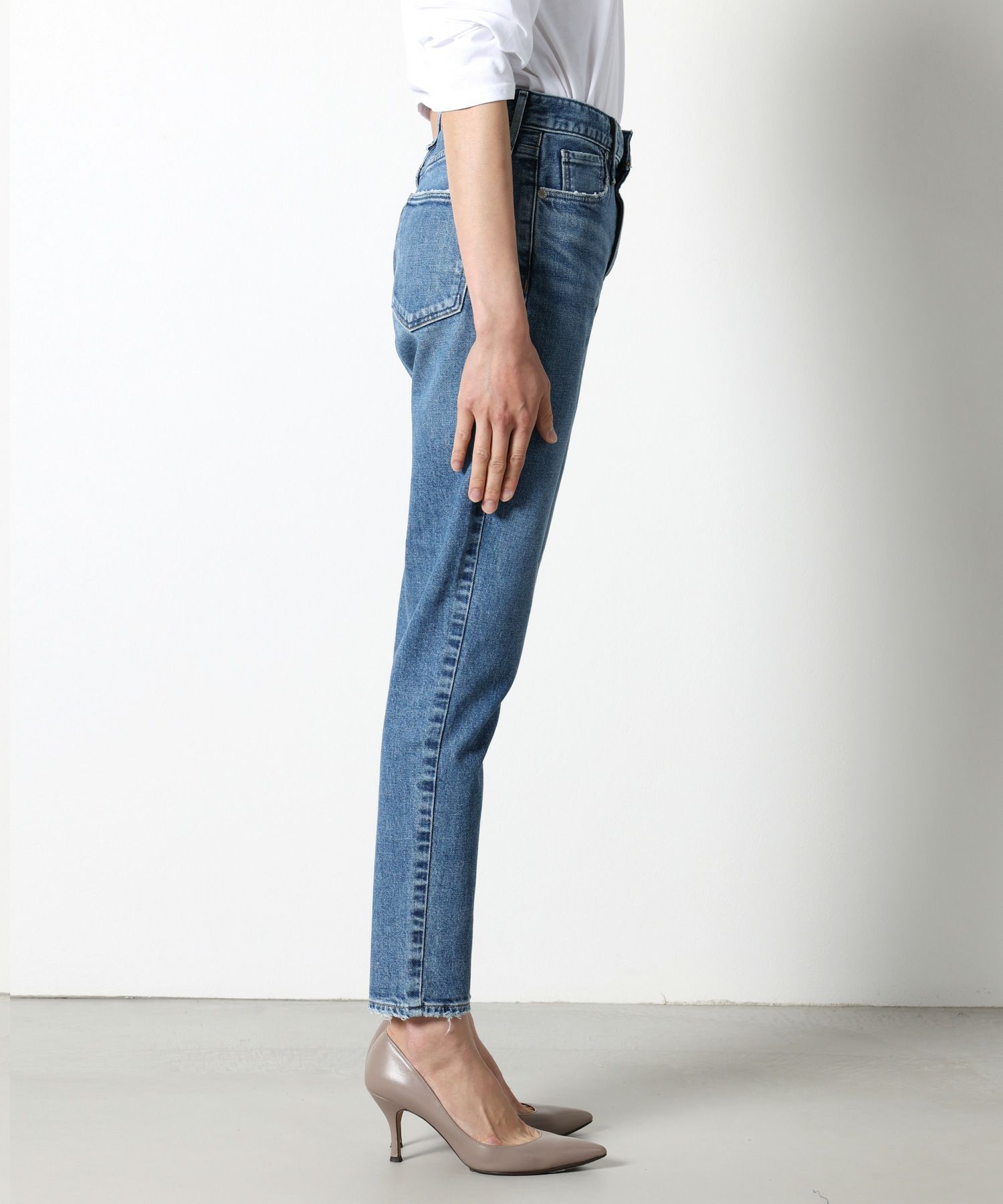 【デザイン】 upper hightsの定番のGIRLFRIEND(SKINNY BOYFRIEND )シルエット「THE STELLA(ザ ステラ)」からハイライズが登場。太すぎないスッキリとしたスタイリッシュなボーイズシルエットが最大の特徴。股上が4㎝長くなっただけなので、通常STELLAと同じサイズ感。9分丈設定にしているため、お直しせずにジャストレングスで裾の加工感も楽しめます。