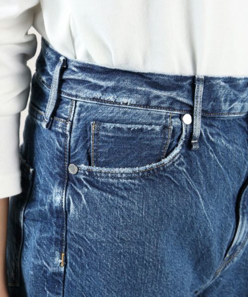 【素材】デニムらしいオーセンティックな表情の綿100%デニム地を採用。2023AWの新色LAKEは、ヒゲや擦りの少ない濃いめのブルーで、ヴィンテージを想起させるカラーです。