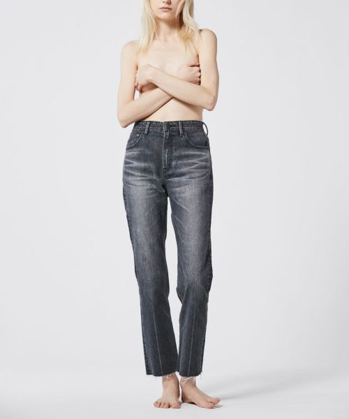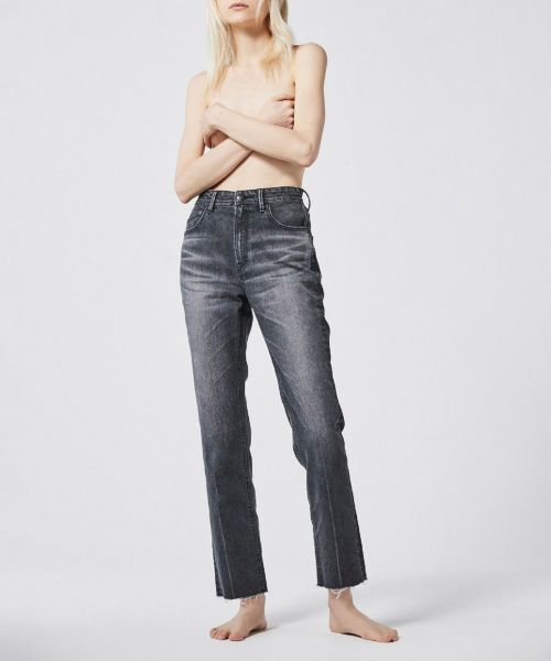 ハイウエストストレートのカットオフデニム。ウエストからヒップにかけて身体に沿い、太ももから下はゆとりをもたせたストレートです。裾にかけて少しだけ細くしており、脚をきれいに見せてくれます。またセンターラインが入っているため、よりタテのラインを強調してくれます。さりげないカットオフもポイントです。生地は、本格デニムの見た目ながらストレッチが効いており、穿き心地も抜群。モードすぎず、カジュアルすぎないウォッシュドブラックを目指し、何度もテストを行ったカラーです。