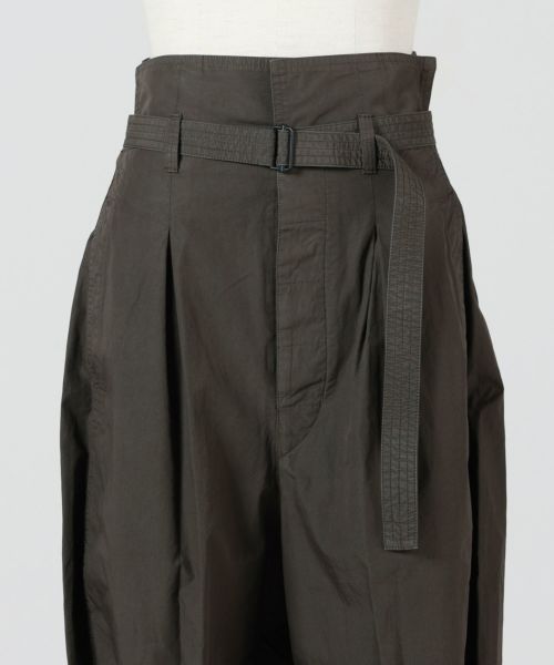 【デザイン】LEMAIRE(ルメール)のパンツ。ボタン留めの折り返し式ウエストバンドとボタンフライが最大の特徴です。共布のバックルベルトでフィット感を調節可能。トレンチコート風のトップステッチが施された両サイドシームポケットと、バックにはウェルトポケットを2つ備え、機能性を高めています。全体に施された同系色のトップステッチが、全体のスタイルを洗練させたパンツです。