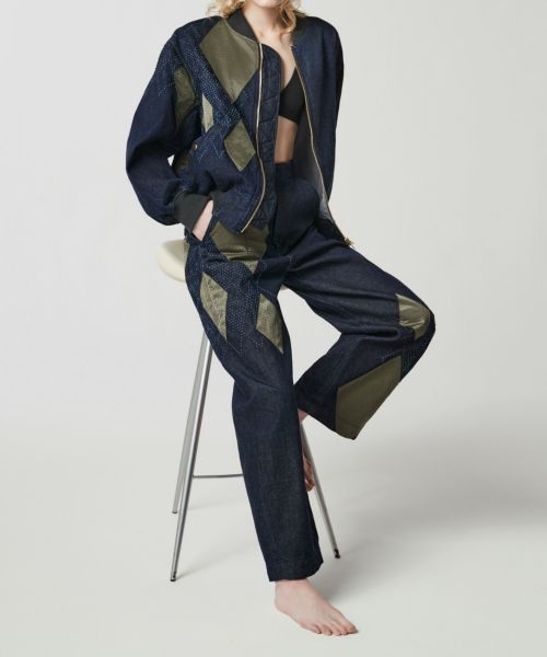 デニムとナイロンを組み合わせたカーブシルエットのパンツ。レーザーによるパンチング加工でアーガイル柄を表現し、洗い加工によりパンチング部分に花が咲いたような立体感が生まれています。ナイロンのドッキングで華やかな光沢感をプラスした新しいデニムパンツです。