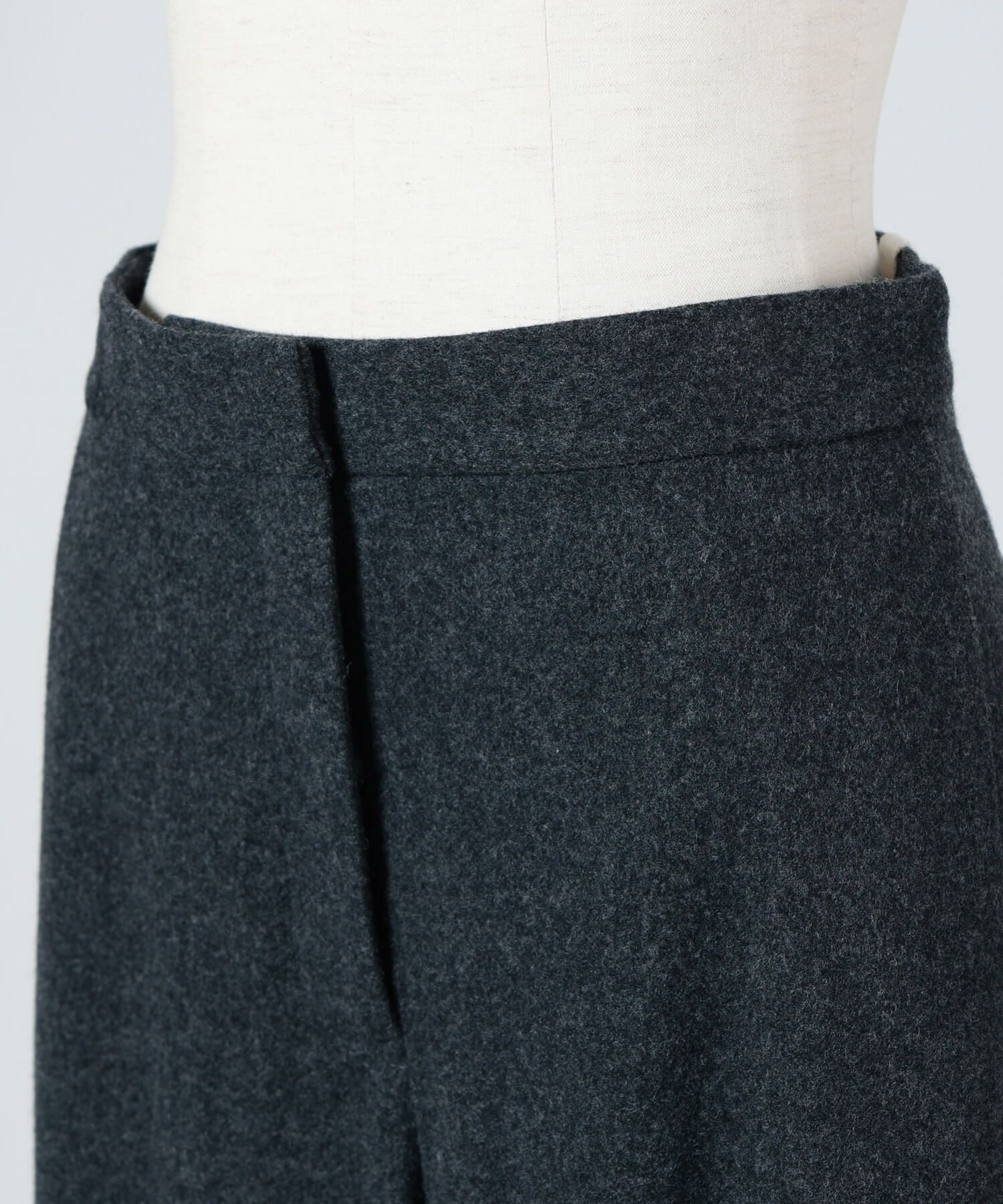 【素材】表地は上質なウール100%を使用し、柔らかくふんわりとした肌触りと、程よい厚みで生まれる美しいドレープが特徴。視覚的にも上品なマット感があり、秋冬らしい温もりを感じさせます。裏地にはレーヨン100%を採用し、さらりとした滑らかな肌当たりで、タイツやインナーとのレイヤード時もストレスなく着用可能。長時間穿いても型崩れしにくく、きちんと感とリラックス感を両立させた一本です。