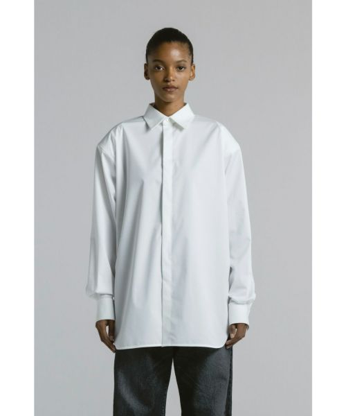 【デザイン】 CINOH(チノ)のシャツ。肩パッドを備えたパワーショルダーが印象的な一着。肩幅はややドロップし、力強さと自然な抜け感を両立させたシルエットに。肘からウエストにかけて配されたコンシールファスナーを開ければ、スリーブレスのようなアレンジも可能で、季節やスタイリングに応じた柔軟な着こなしが楽しめます。