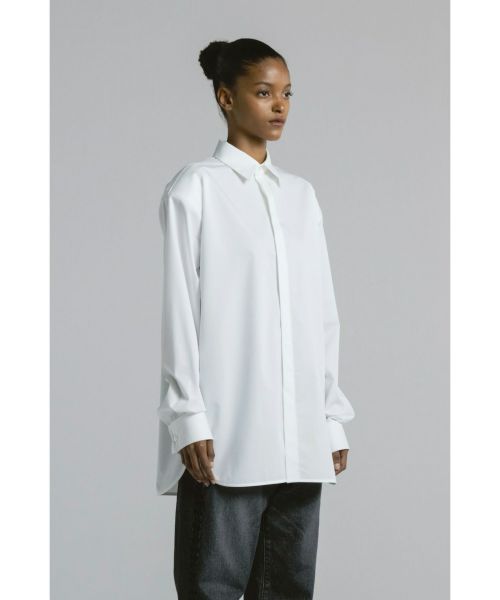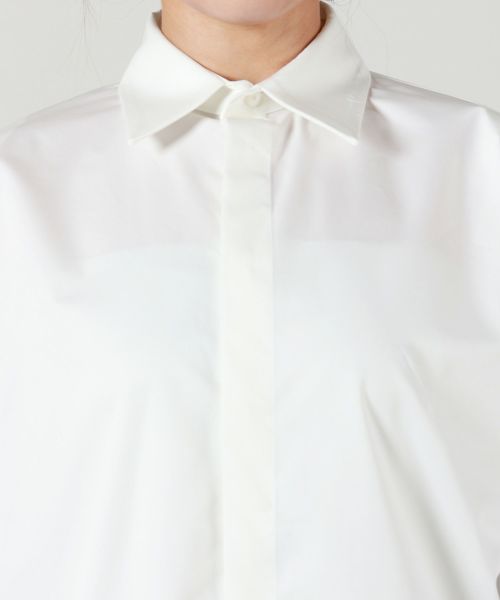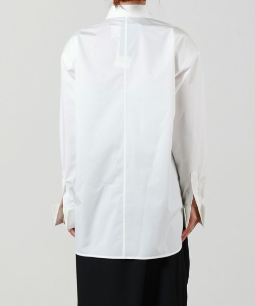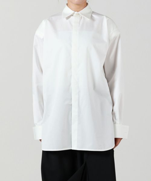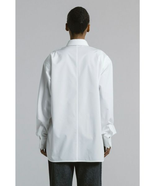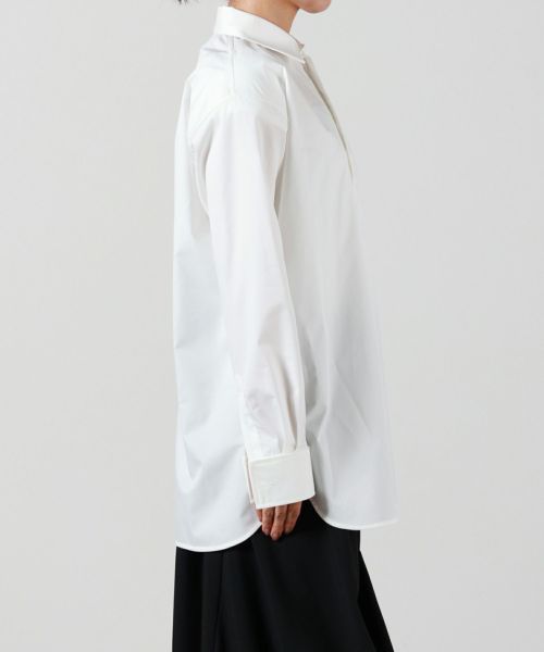 袖にはたっぷりとボリュームを持たせ、動きのあるフォルムを演出。ダブルカフス仕様の袖口は、折り返してロングカフスとしても着用でき、細部にまで配慮されたモダンなデザインが魅力です。新鮮なシルエットと高い実用性を併せ持つ、主役級のシャツです。