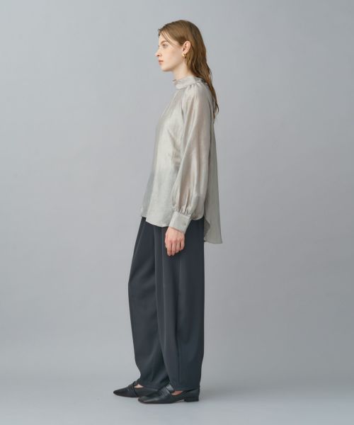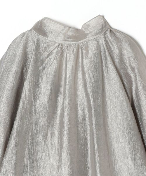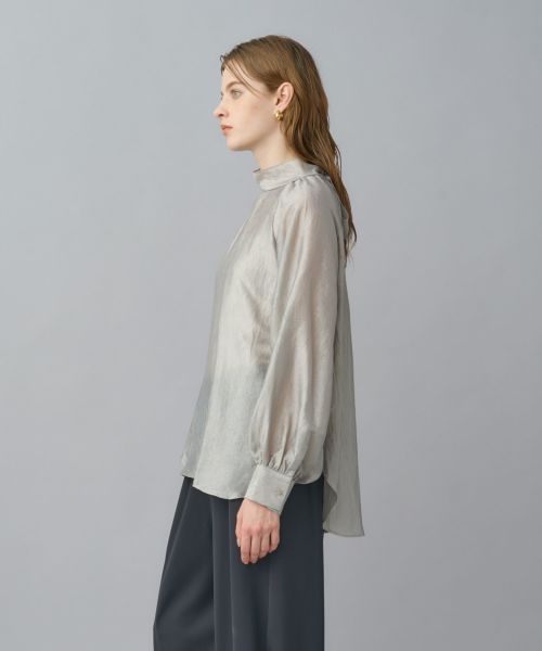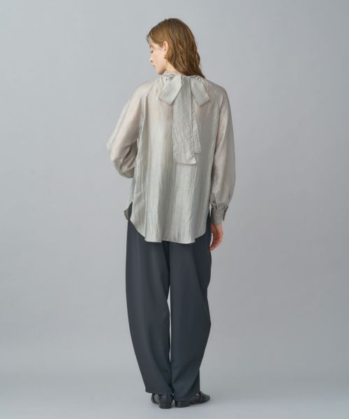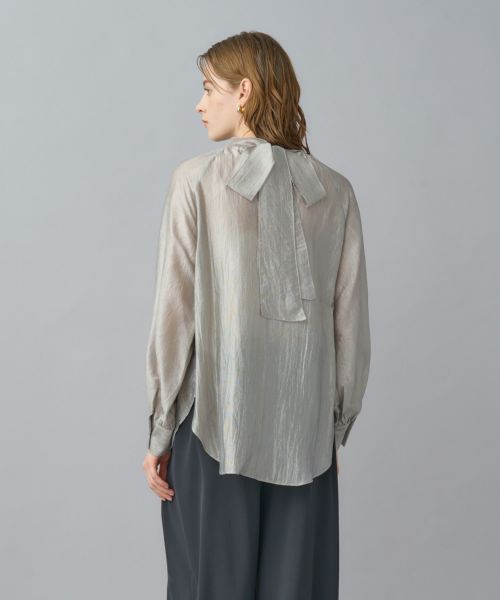 バックリボンがアクセントになったシャイニーブラウス。 ゆったりとしたシルエットで体型を拾いにくく、スタイルアップも叶えます。ハイネックデザインでクラシカルな雰囲気を演出。
