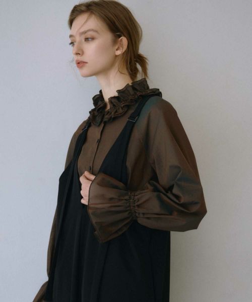 顔まわりを華やかに彩る存在感のあるフリル襟が印象的なデザイン。