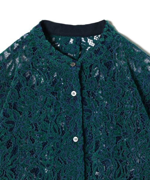 フラワーモチーフのフロッキーレースを贅沢に使用したバンドカラーシャツ。