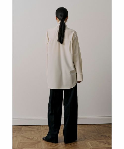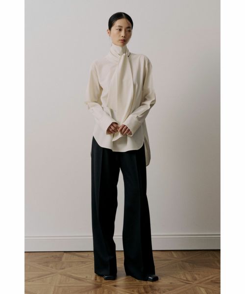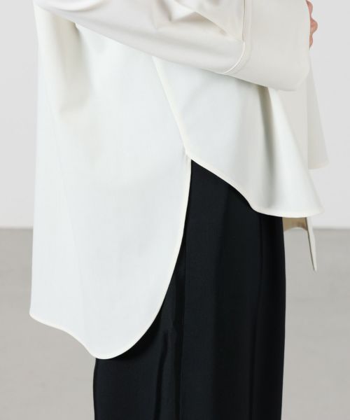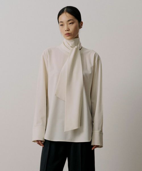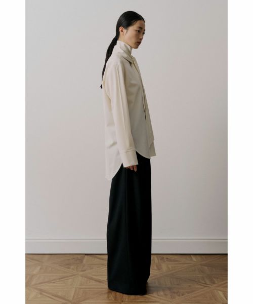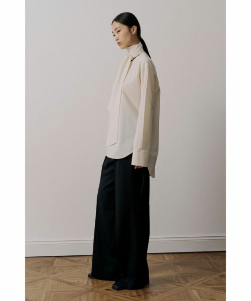 【デザイン】 UJOH(ウジョー)のシャツ。後ろ身頃から流れるように続くボウタイが印象的な、構築的なデザインシャツ。タイを前で結んだり垂らしたりと、アレンジ次第で異なる表情が楽しめます。背面に施された大胆なカッティングが、さりげなく肌をのぞかせ、フェミニンさとモード感を共存。さらに、袖に加えられたつまみ縫いのディテールが立体的な陰影をつくり、全体のバランスに奥行きを与えています。クラシカルなシャツスタイルをベースにしながら、独自の視点で再構築されたUJOHならではの一枚です。