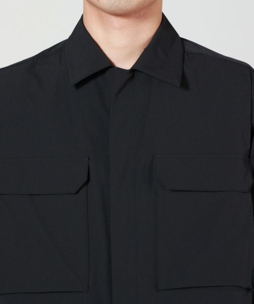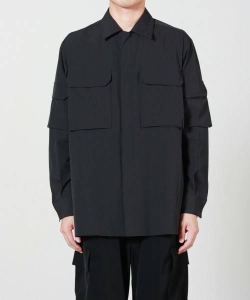 【デザイン】th products(ティーエイチプロダクツ)のミリタリーシャツ。ブランドならではのモダンな視点で再構築された一着です。フロントはスナップボタン仕様で、軽快に着脱が可能。胸元には大きめのポケットを2つ、さらに両袖にもポケットを備え、ミリタリーアイテムの機能性を感じさせながらも都会的な雰囲気に仕上げています。袖口もスナップボタン仕様でフィット感を調整でき、シャツとしてはもちろんライトアウター感覚でも着用可能。全体的に程よいゆとりを持たせたシルエットは、シンプルながらも存在感を放ち、カジュアルからモードなスタイリングまで幅広く対応できる汎用性の高さが魅力です。