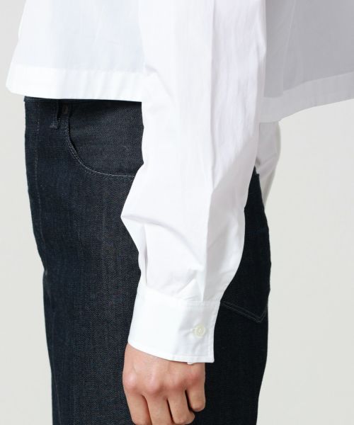 【デザイン】MAISON KITSUNE(メゾンキツネ)のクロップド丈シャツ。ウエスト位置を高めに見せるショート丈で、ボトムスとのバランスが抜群なアイテム。襟付きシャツのきちんと感と、ややゆとりを持った身幅、バックにはプリーツが入っており前後で異なる表情を演出。袖口はボタン付きのストレートカフ仕様で、袖を少しまくるなどのアレンジもしやすいデザイン。胸元には “ベイビーフォックス” の刺繍パッチが配されており、ブランドのアイコンをさりげなく取り入れつつ、遊び心あるワンポイントとして機能します。刻印入りボタンで仕上げられたクラシカルな仕様も、上質な印象を高めます。