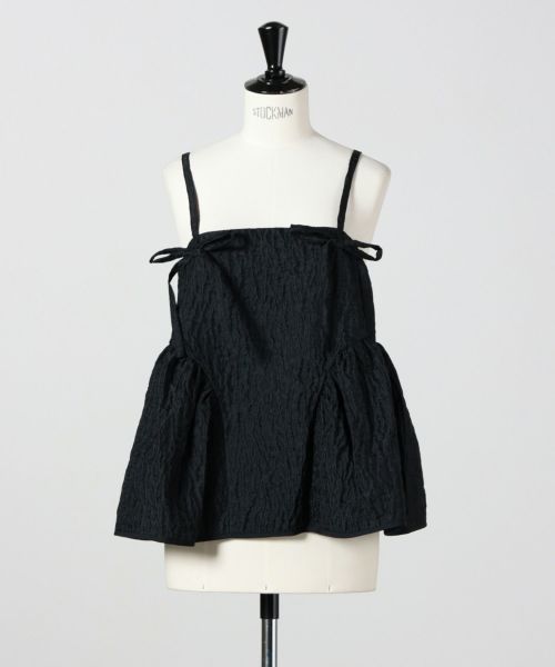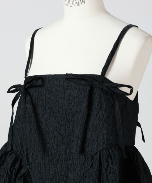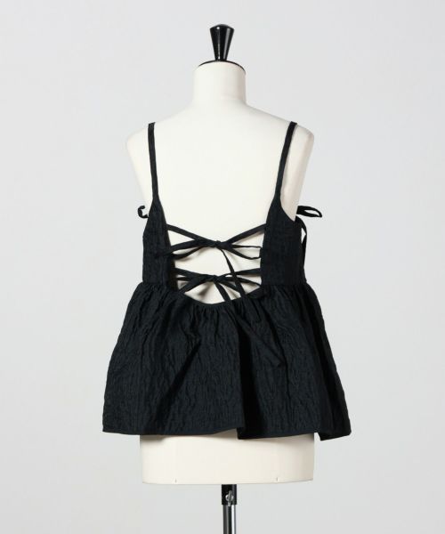 【デザイン】 Cecilie Bahnsen(セシリー バンセン)のトップス。ロマンティックでモダンな印象を与える「Akira トップス」は、Cecilie Bahnsenらしい繊細なディテールが際立つ一枚。ギャザー入りのヒップパネルと、背中を美しく魅せるオープンバックは、リボンで結ぶデザインが特徴的です。ショルダーストラップにもリボンを配し、全体にフェミニンなアクセントをプラス。ストレートネックラインが甘さをほどよく引き締め、洗練されたバランスに仕上がっています。
