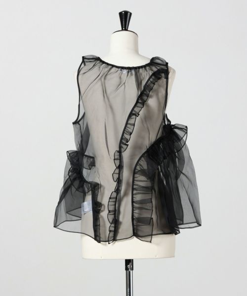 【デザイン】Cecilie Bahnsen(セシリー バンセン)のブラウス。モダンなエレガンスとフェミニンな魅力を兼ね備えた一着です。すっきりとしたノースリーブと優美なスクープネックがデコルテを美しく演出。フロントからバックにかけてあしらわれたアシンメトリーなラッフルが軽やかな動きを生み、後身頃に施された繊細なプリーツが立体感をプラスします。シックなブラックカラーが甘さを引き締め、ドレスアップからデイリーまで幅広く活躍できるデザインです。