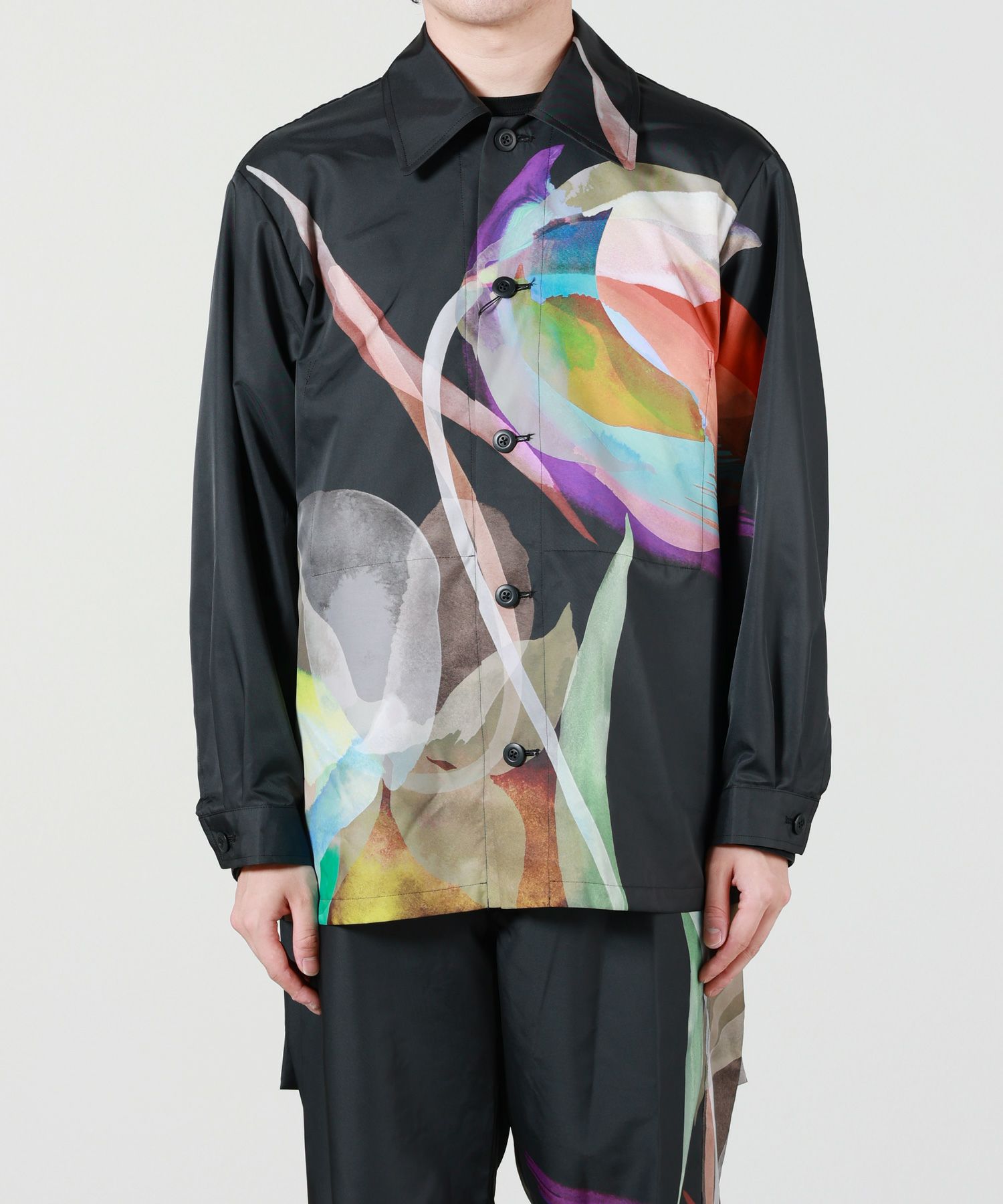 【デザイン】 UJOH(ウジョー)の長袖Tシャツ。「チューリップ」と「スイセン」をモチーフにした抽象的ながらも大胆な花柄です。共に冬から春の寒い時期に花をつける為、強くたくましく成長する姿を表現しています。 シャツ型をデザインベースに、ブルゾンの要素を取り入れたモダンなスタイルです。アクセントとなる内ポケットを備えており、実用性を高めつつ、シンプルさを損なわないデザインに仕上げています。