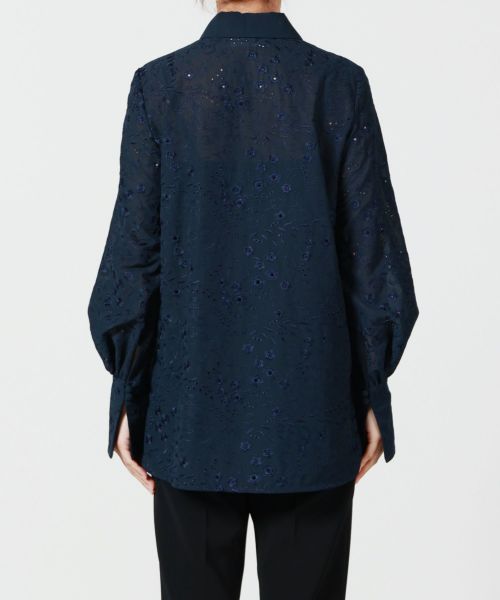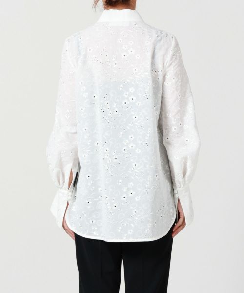 【デザイン】Mame Kurogouchi(マメ クロゴウチ)のブラウス。手刺繍風のシフォン刺繍を袖、カフス、襟に贅沢にあしらい、立体感と華やかさを演出。丸みのある袖とゆったりとしたシルエットで1枚でも軽やかな印象を与え、ベストやドレスとのレイヤードスタイルも楽しめる、デイリーからオケージョンまで幅広く活躍する1着です。