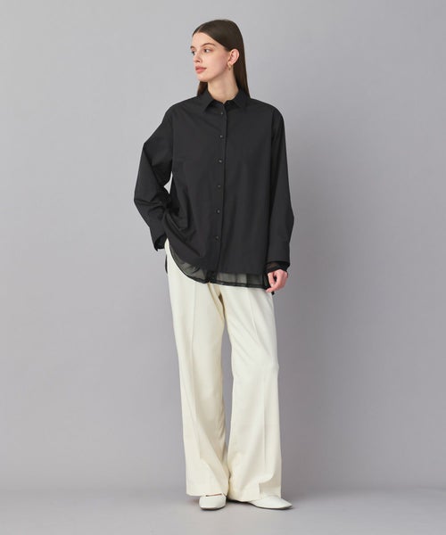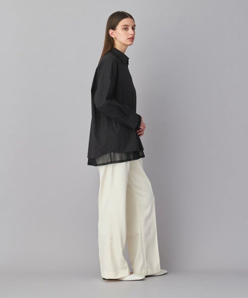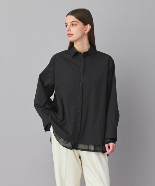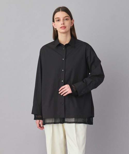 ベーシックなシャツに、袖口と裾へチュールをレイヤード。異素材の組み合わせが、シンプルすぎず、モードな雰囲気を演出します。