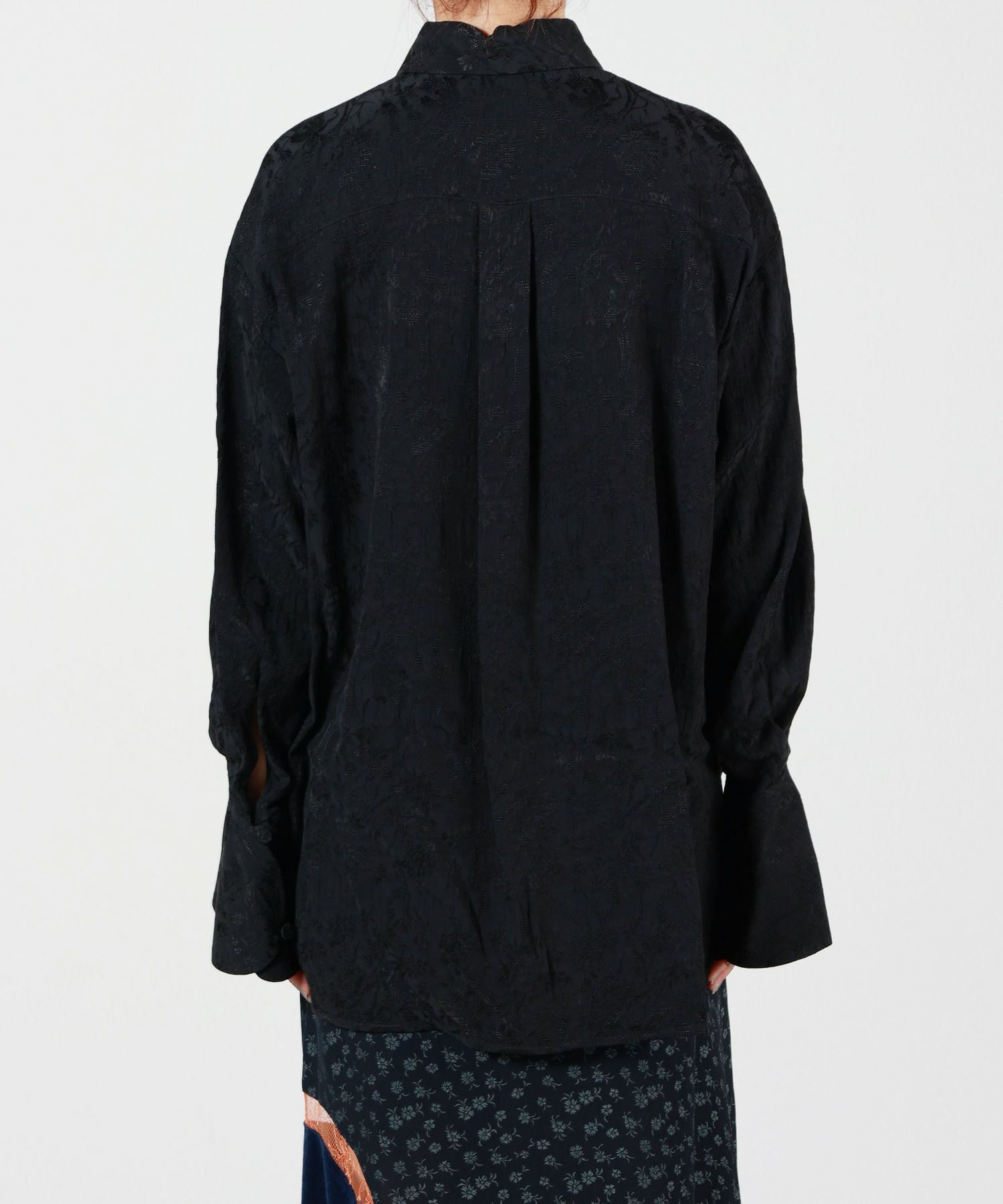 【デザイン】Mame Kurogouchi(マメクロゴウチ)のシャツ。繊細な花柄のジャカード織が美しく浮かび上がる、品のある一着。組織の違いから生まれる豊かな表情や、ふんわりとした凹凸のある生地感が、着るだけで優美な印象を与えてくれます。やや大きめにデザインされた襟元や、袖先にかけて広がるカフスなど、クラシックなムードを感じさせるディテールも魅力的。身体のラインを拾いすぎないゆったりとしたシルエットながら、着た時にすっきりと見える絶妙なカッティングで、単品でも主役になる存在感を持ったアイテムです。デニムやスラックス、スカートなど、ボトムス次第で様々なスタイリングが楽しめます。
