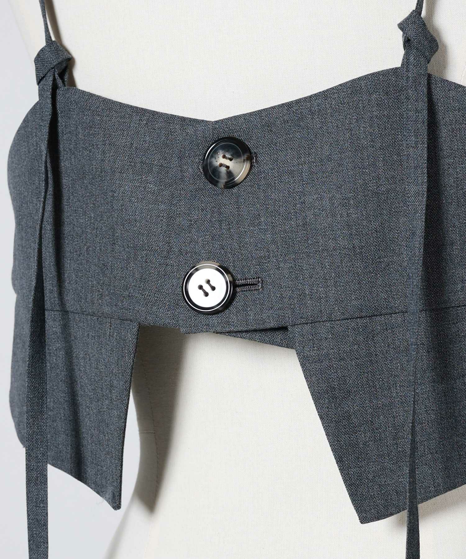 【デザイン】ENFOLD(エンフォルド)のビスチェ。レイヤードスタイルに取り入れやすい、キャミソールタイプのデザインパーツです。肩紐は長さ調整が可能で、体型や合わせるインナーに応じてフィット感を調整できる仕様。さらに、バスト周りには調節ボタンを備え、厚手のニットの上からでも無理なく着用できます。シンプルなトップスに重ねるだけで、装いに立体感と奥行きをプラス。ワイドTRパンツやZigzagスカートとのセットアップスタイルもおすすめです。