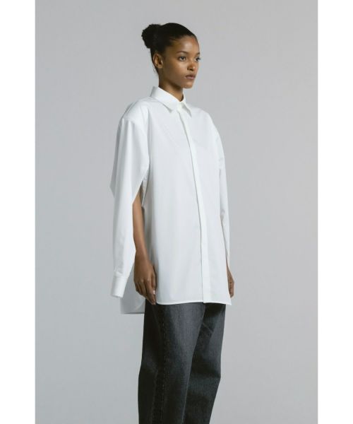 【デザイン】 CINOH(チノ)のシャツ。肩パッドを備えたパワーショルダーが印象的な一着。肩幅はややドロップし、力強さと自然な抜け感を両立させたシルエットに。肘からウエストにかけて配されたコンシールファスナーを開ければ、スリーブレスのようなアレンジも可能で、季節やスタイリングに応じた柔軟な着こなしが楽しめます。