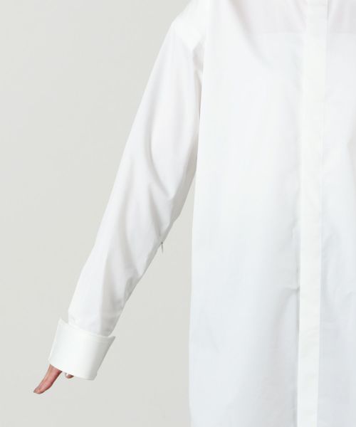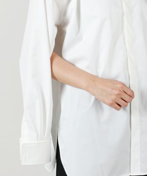 袖にはたっぷりとボリュームを持たせ、動きのあるフォルムを演出。ダブルカフス仕様の袖口は、折り返してロングカフスとしても着用でき、細部にまで配慮されたモダンなデザインが魅力です。新鮮なシルエットと高い実用性を併せ持つ、主役級のシャツです。