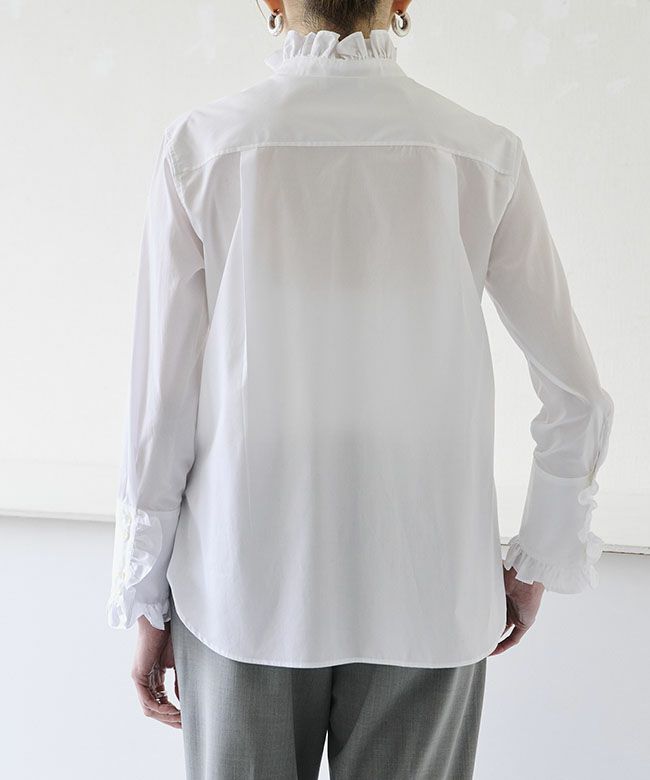 高品質な生地の美しさを邪魔しないよう、縫い代やフリルの端は細くスッキリと仕上げています。ジャケットに合わせてかっちりスタイリングしていただくのももちろん、ニットなどの柔らかくぬくもり感のあるアイテムと合わせてもきりっとした印象に仕上げてくれます。