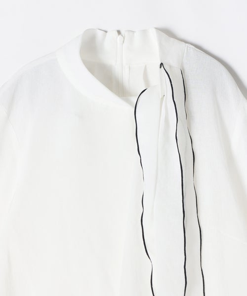 【デザイン】ボウタイ使いがフェミニンなブラウス。配色メローデザインが全体のアクセントになっています。合わせるボトム次第でオンオフ様々なシーンで活躍します。羽織った際もフロントデザインの活きるトレンドを抑えたフェミニンな印象を与えるアイテムです。