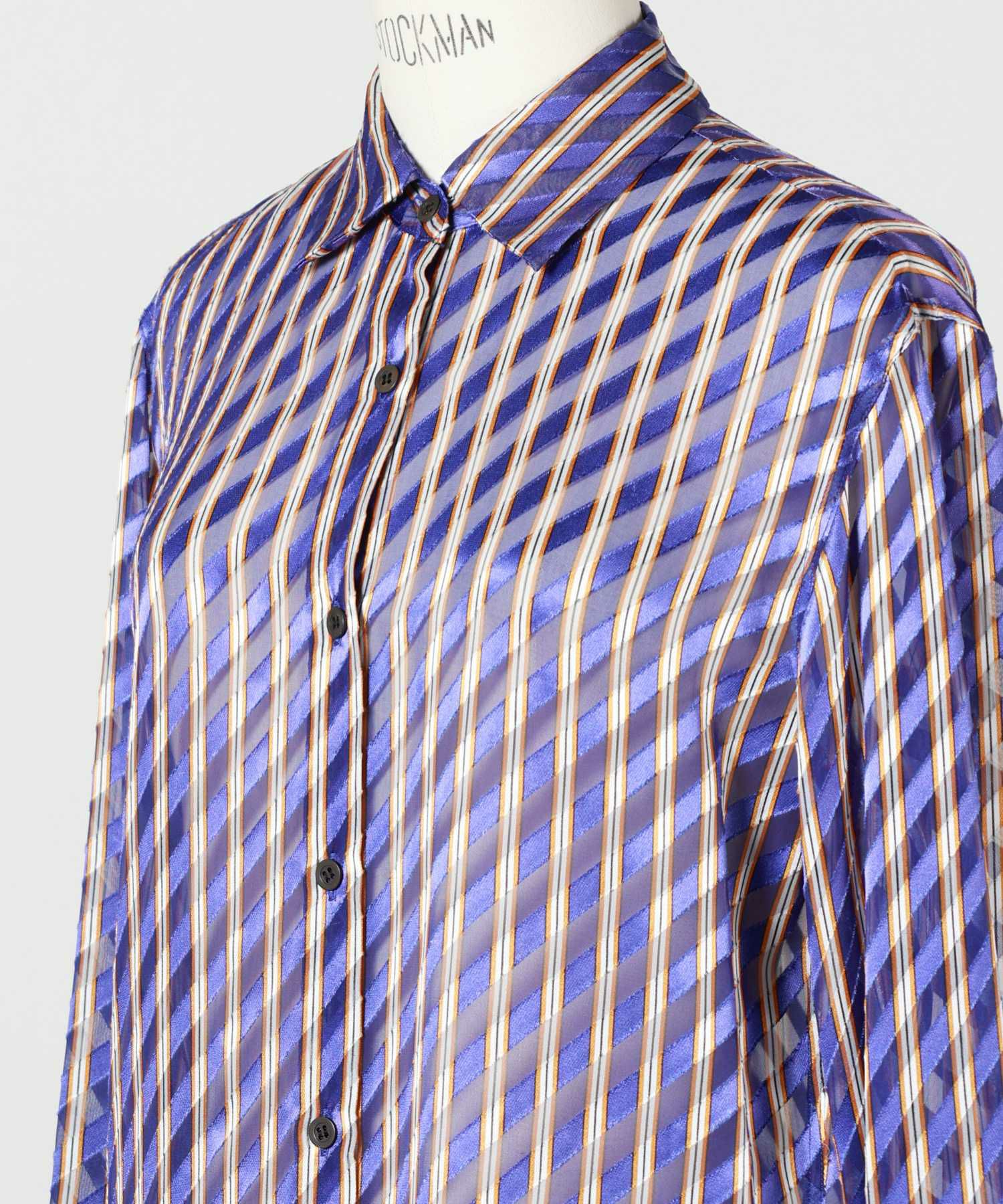 【デザイン】DRIES VAN NOTEN(ドリス ヴァン ノッテン)のシャツ。斜めに走るストライプ柄が印象的な一枚で、動きに合わせて表情が変わる奥行きのあるデザインが魅力です。シルエットはレギュラーフィットで、身体のラインを拾いすぎず、リラックス感と上品さを両立。フロントはボタン仕様、袖口もボタン留めで、きちんと感のある仕上がりです。デザイン性が高いながらも派手すぎず、ジャケットのインナーとしても、1枚着としてもスタイリングに自然に溶け込みます。