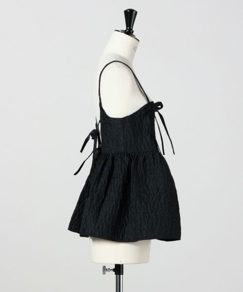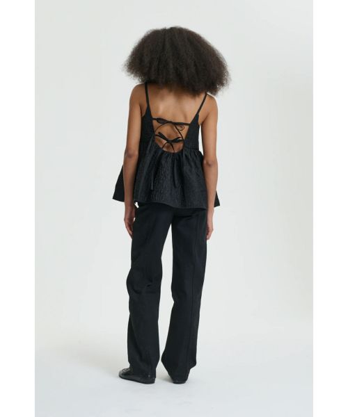 【デザイン】 Cecilie Bahnsen(セシリー バンセン)のトップス。ロマンティックでモダンな印象を与える「Akira トップス」は、Cecilie Bahnsenらしい繊細なディテールが際立つ一枚。ギャザー入りのヒップパネルと、背中を美しく魅せるオープンバックは、リボンで結ぶデザインが特徴的です。ショルダーストラップにもリボンを配し、全体にフェミニンなアクセントをプラス。ストレートネックラインが甘さをほどよく引き締め、洗練されたバランスに仕上がっています。