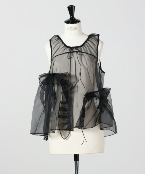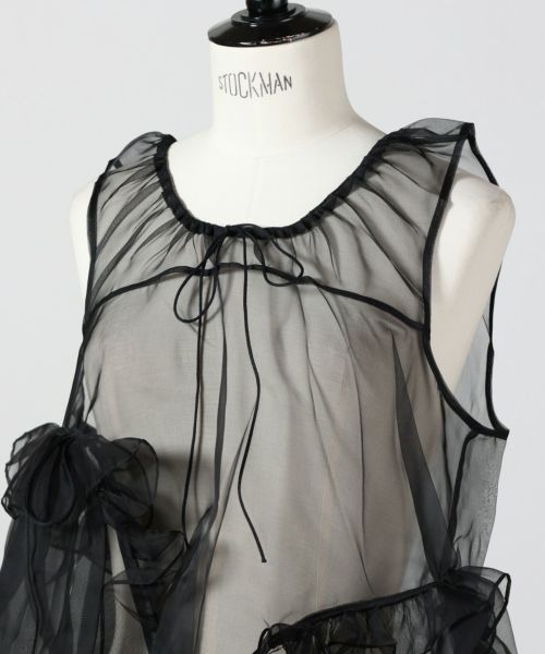 【デザイン】Cecilie Bahnsen(セシリー バンセン)のブラウス。モダンなエレガンスとフェミニンな魅力を兼ね備えた一着です。すっきりとしたノースリーブと優美なスクープネックがデコルテを美しく演出。フロントからバックにかけてあしらわれたアシンメトリーなラッフルが軽やかな動きを生み、後身頃に施された繊細なプリーツが立体感をプラスします。シックなブラックカラーが甘さを引き締め、ドレスアップからデイリーまで幅広く活躍できるデザインです。