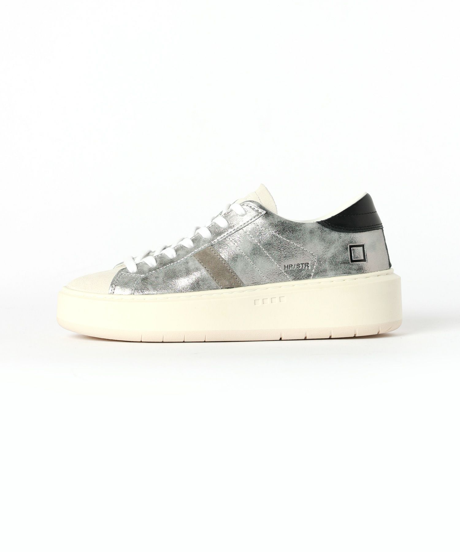 【デザイン】D.A.T.E.(デイト)のスニーカー。ユニークなメタリック調レザーが印象的な厚底スニーカーです。 ブラックのヒールパッチとコントラストの効いたデザインが存在感を強調。 スエードトゥとサイドの異素材コンビネーションがスタイリッシュな印象のアイテム。 4cmの高さの縫い目があるゴム製プラットフォームソールを採用しています。 クッション性に優れた厚底ソールで快適な履き心地を実現。 エッジの効いたカラーリングでコーディネートのアクセントに。 カジュアルからモードスタイルまで幅広く対応する万能なスニーカーです。