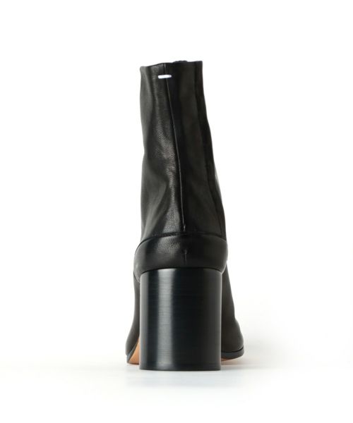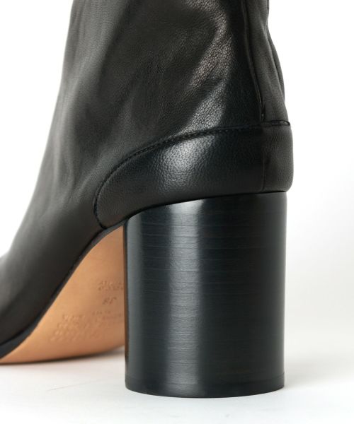 【デザイン】Maison Margiela(メゾンマルジェラ)のブーツ。 伝統と革新が融合したアイコニックな「タビ」ブーツです。15世紀の日本の伝統的な足袋から着想を得た、特徴的なスプリットトゥのデザインが目を引きます。やわらかなラムレザーを使用したアッパーは、足にぴったりとフィットし、履き心地を追求した一足。8cmのシリンダーヒールがモダンで洗練された印象を与え、スタイルを引き締めてくれます。メゾン マルジェラらしいアバンギャルドなデザインは、シンプルなコーディネートに個性を加え、日常から特別なシーンまで幅広く活躍します。後ろに施されたフックで開閉します。
