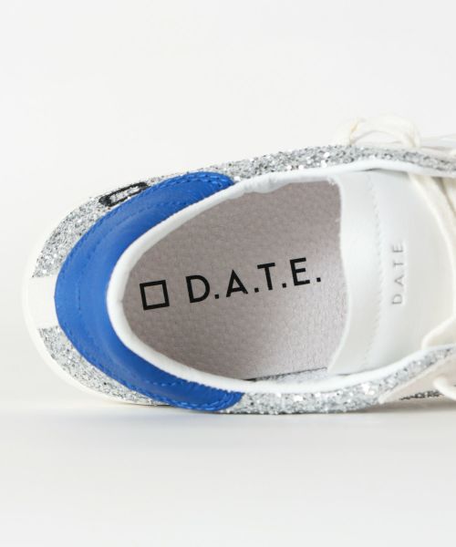 【デザイン】D.A.T.E.(デイト)のスニーカー。グリッター素材を使ったローカットスニーカーです。 アッパーサイドに刻印されたD.A.T.Eのスクエアロゴ、 サイドのレザーバンドとヒールの配色がデザインポイント。 2.5cmのクッションインソールで快適な履き心地です。 D.A.T.Eのスタンダードモデルになります。