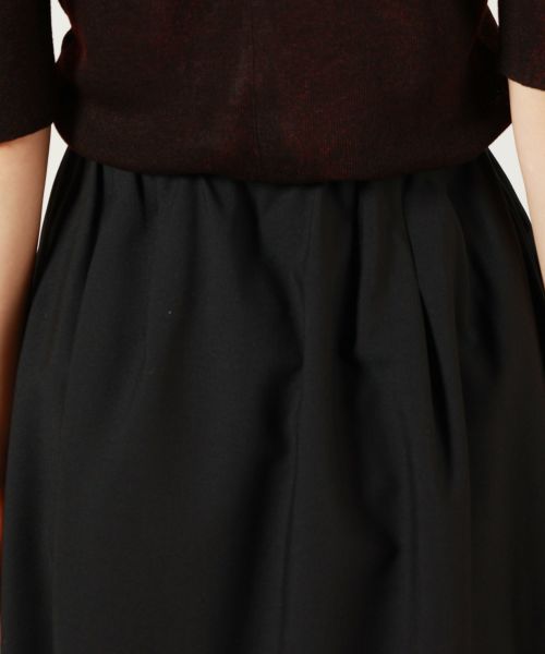 【デザイン】 ELENDEEK(エレンディーク)のスカート。薄手の梳毛調素材を使用し、タックでアシンメトリーにドレープをつくったコクーンスカート。落ち感のある素材なのでボリュームが出すぎず、シンプルなトップスと合わせるだけでモードな雰囲気に。フロントにベンツが入っているので足さばきもカバー。スリットではなく重なりのあるベンツにすることで肌見せを抑えたデザインになっているのもポイントです。