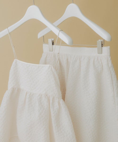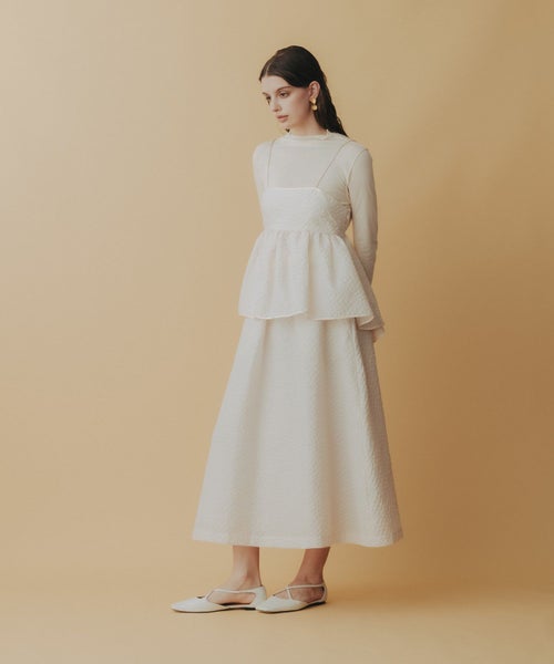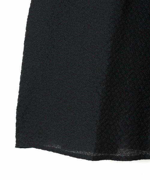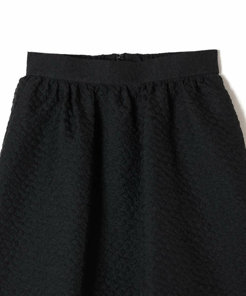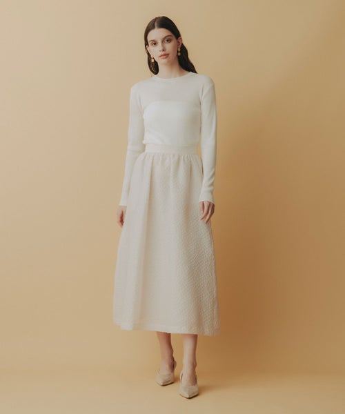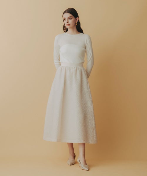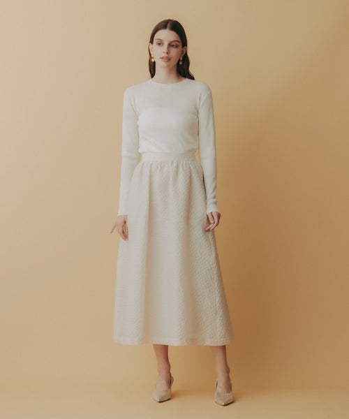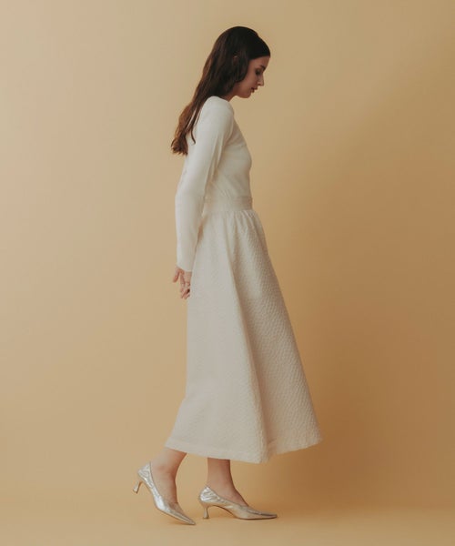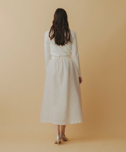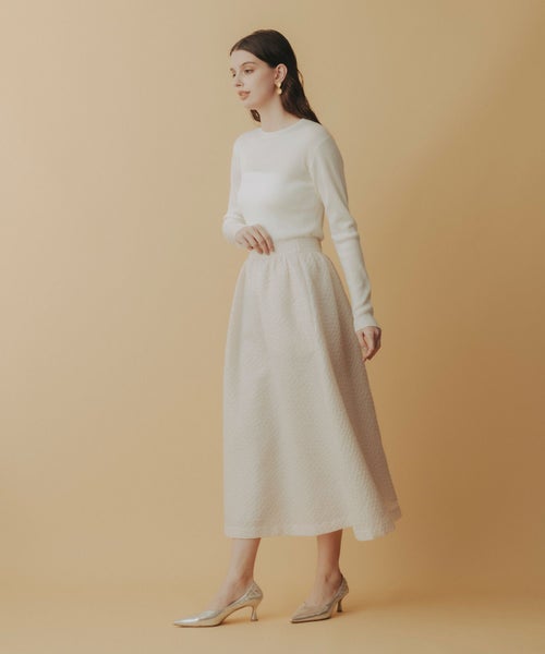 たっぷりとギャザーを寄せたロング丈のフレアシルエットが、歩くたびに優雅に揺れるデザイン。ジャガード特有の適度なハリ感が立体感を生み出し、軽やかさの中に品格を添えます。