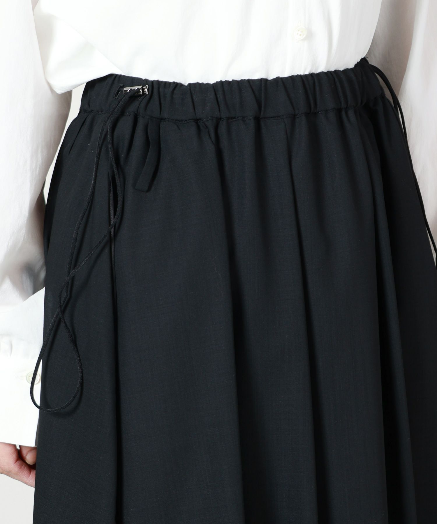 【デザイン】 AKANE UTSUNOMIYA(アカネウツノミヤ)のスカート。シンプルでありながら、動きやすさとデザイン性を兼ね備えた一着です。ウエスト部分はゴムとドローストリングで調整可能で、リラックスした着心地ななか、きちんと感もあるので、カジュアルからきれいめスタイルまで幅広く活躍します。広がりすぎない程よいフレア感で、脚をきれいに見せてくれるため、どんなトップスともバランス良く合わせられ、シーンを選ばず使いやすく、長く愛用できるアイテムです。