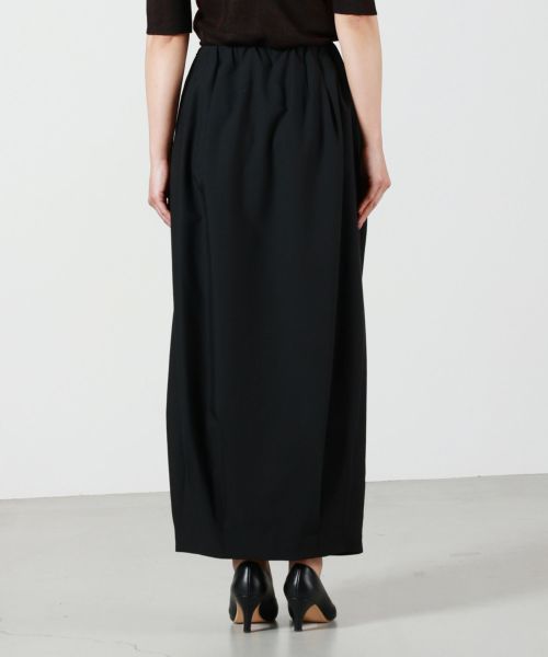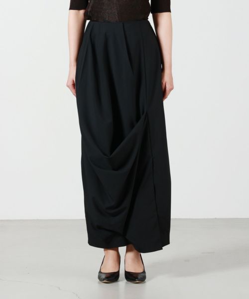 【デザイン】 ELENDEEK(エレンディーク)のスカート。薄手の梳毛調素材を使用し、タックでアシンメトリーにドレープをつくったコクーンスカート。落ち感のある素材なのでボリュームが出すぎず、シンプルなトップスと合わせるだけでモードな雰囲気に。フロントにベンツが入っているので足さばきもカバー。スリットではなく重なりのあるベンツにすることで肌見せを抑えたデザインになっているのもポイントです。