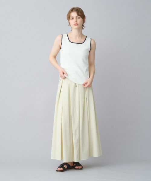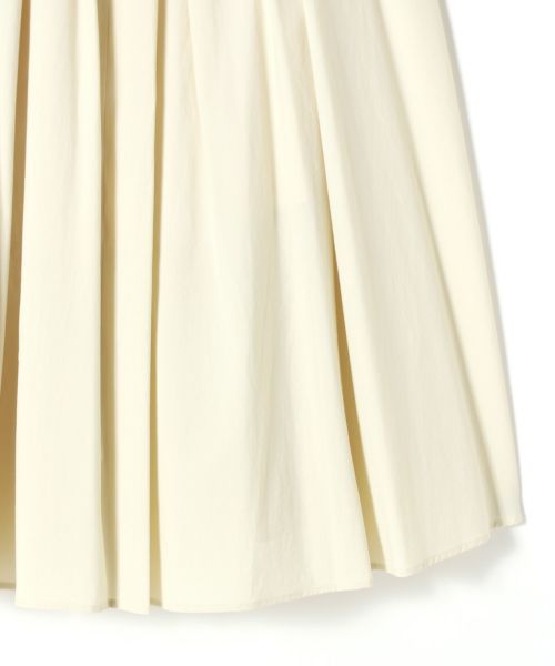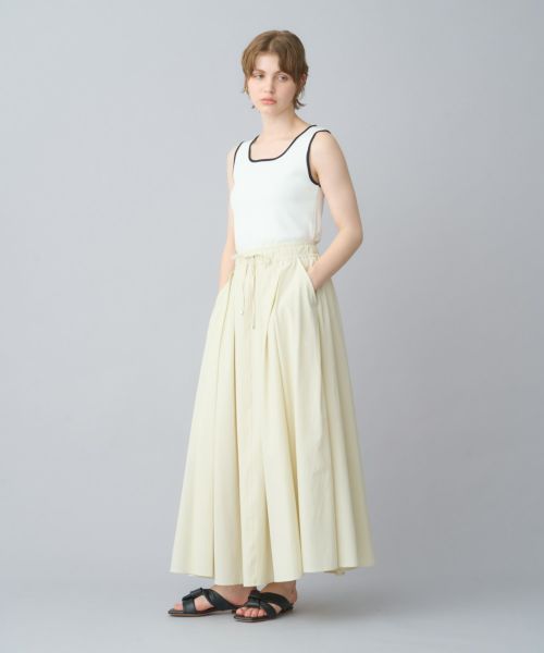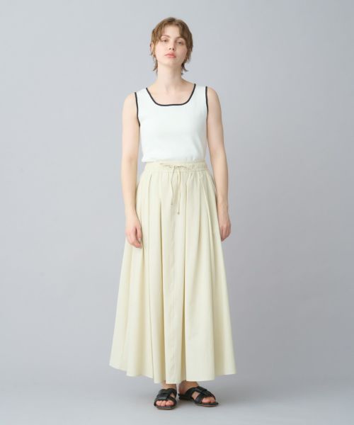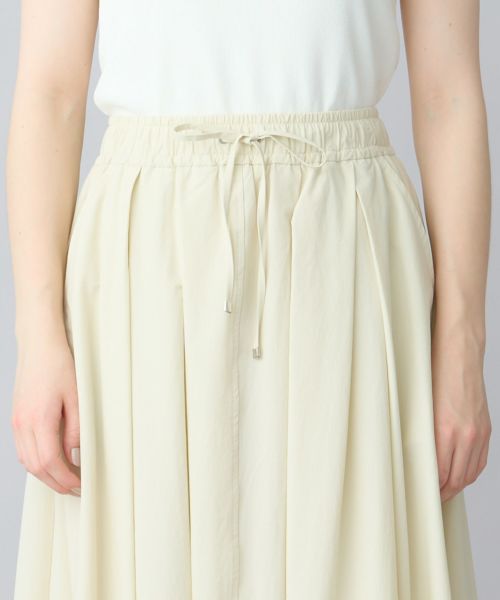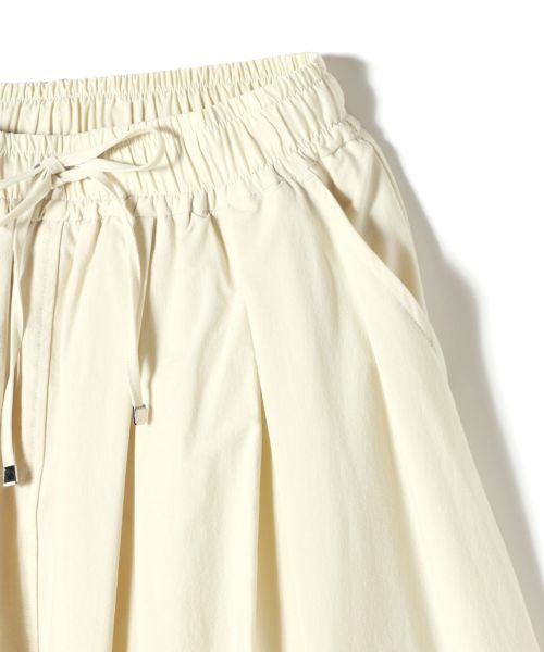 【デザイン】たっぷりと分量感のあるフレアスカート。ウエストのゴム仕様とドローストリングでイーシーな履き心地です。ナイロンのハリ感と軽さが構築的なシルエットを演出します。