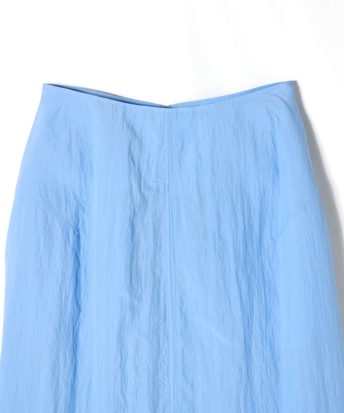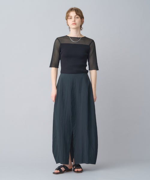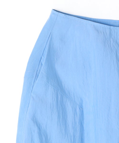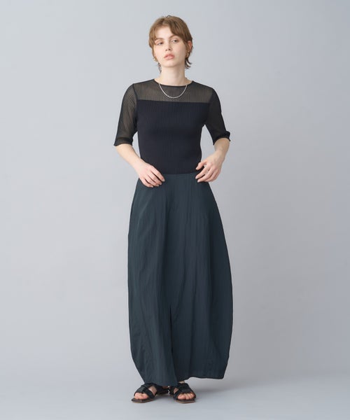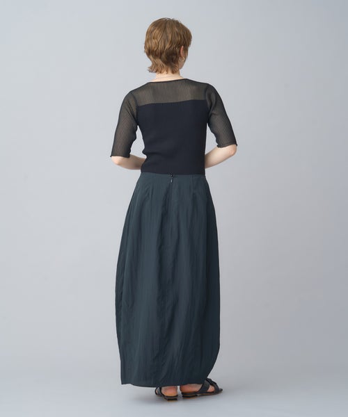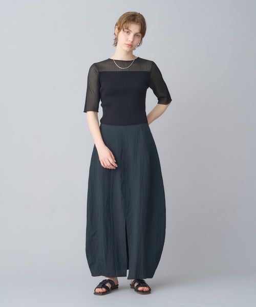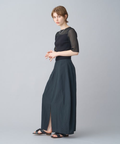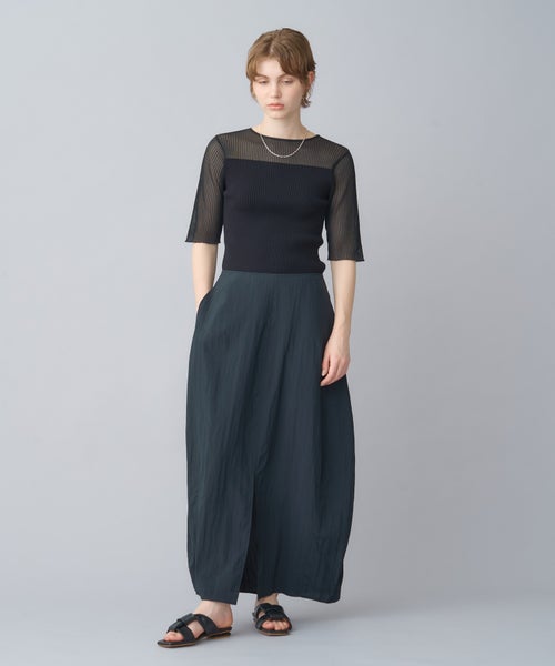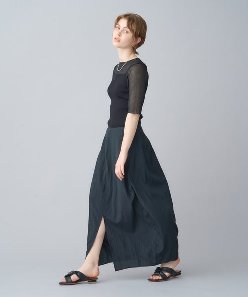 【デザイン】 PARIGOT(パリゴ)のスカート。丸みを帯びたボリューム感のあるコクーンシルエットのスカート。フロントには深めのスリットを施しており、足さばきが良く抜け感を演出します。裾にかけてややすぼませたデザインで、動きやすさとシルエットの美しさを両立しています。