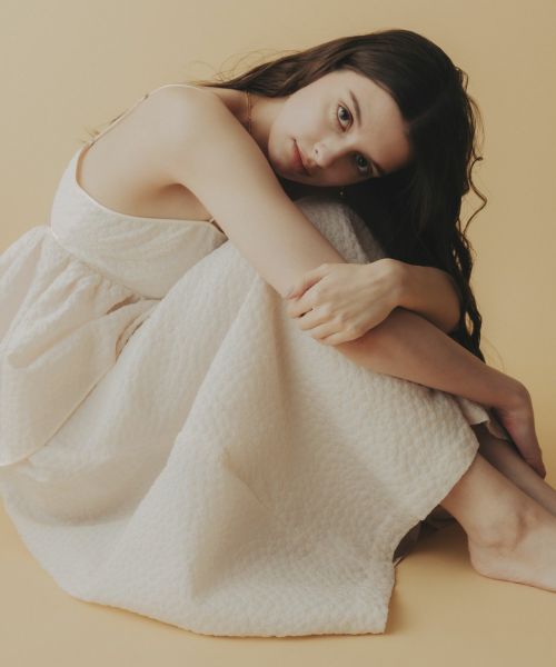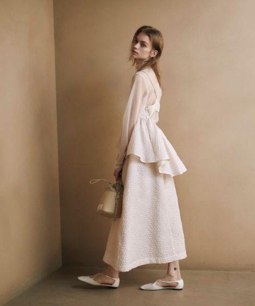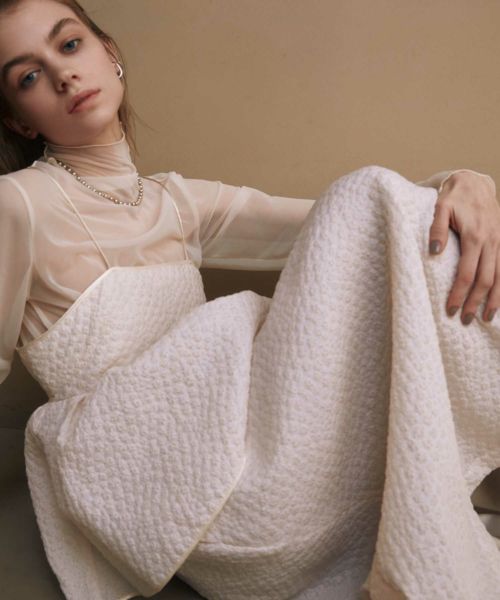 たっぷりとギャザーを寄せたロング丈のフレアシルエットが、歩くたびに優雅に揺れるデザイン。ジャガード特有の適度なハリ感が立体感を生み出し、軽やかさの中に品格を添えます。