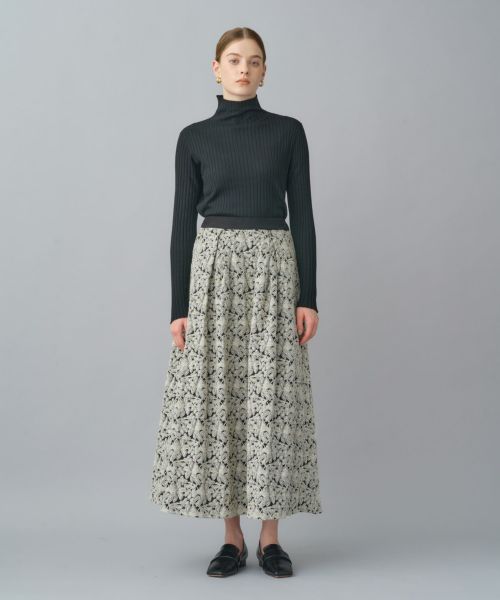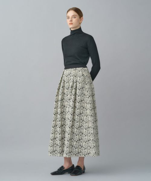 印象的なフラワージャガードが華やかなフレアロングスカート。タックを入れたボリューム感のあるシルエットが、歩くたびに優雅に広がり、ドラマティックな存在感を放ちます。特別な日にも、日常のスタイリングにも華を添えてくれる一枚です。